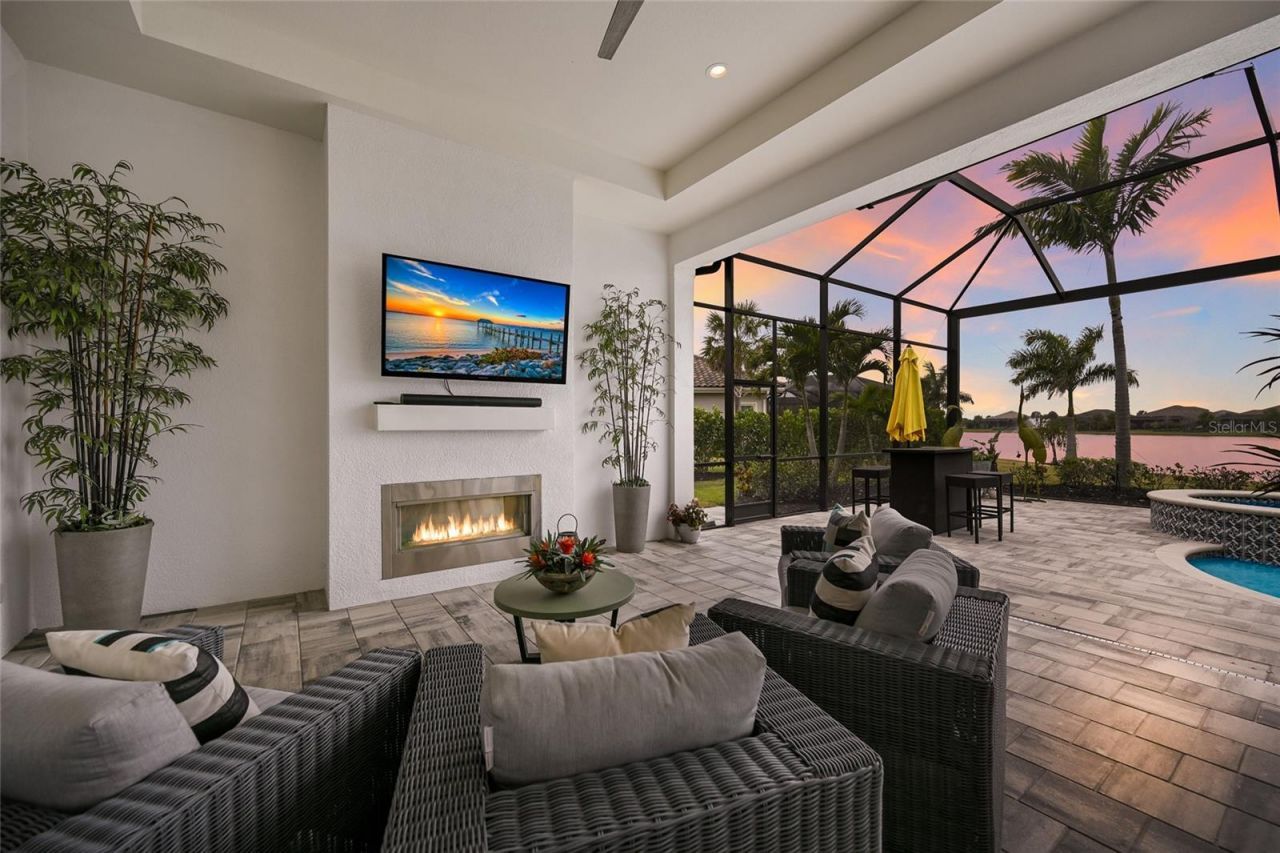 Positioned on one acre inside the exclusive gated community of The Lake Club with breathtaking lakefront westerly views, herein lies an unparalleled opportunity in this 3,734 square foot residence that uniquely offers the recent addition of a magnificent GUEST HOUSE. Added in 2024, the newly built separate entry living quarters offers two bedrooms, two full bathrooms, great room, den and its own kitchenette complete with microwave, refrigerator drawers, freezer and dishwasher. Meanwhile, the main house is a stylishly open one-story plan that exudes thoughtfully planned living spaces, accentuated volume ceilings, skillfully selected finishes, and, of course, all IMPACT windows/doors/sliders. The expansive outdoor retreat elevates the Florida living experience with a panoramic screened lanai, extensive open and under cover spaces, soaring ceilings, full summer kitchen, PebbleTec heated saltwater pool/spa, and an inviting gas fireplace. Ten foot impact disappearing glass sliders seamlessly connect the outdoor oasis to a luxuriantly welcoming great room, dining area and gourmet kitchen crowned with coffered ceiling, accent wall, and designer light fixtures creating a sophisticated open continuity of space. Off the dining room, the gourmet kitchen further accentuates with wood cabinetry, soft-close dove-tail drawers, newly installed quartz counters and backsplash, stainless steel appliances, wine fridge, and walk-in pantry. Relax and unwind in the owner's quarters positioned on a private wing, offering double tray ceilings, large scale windows, direct lanai access, two oversized walk-in customized closets, and a luxuriously appointed bath with dual station vanity, an oversized shower with designer tile, a large soaking tub, and separate water closet. There are two additional guest suites in the main house, each on a separate wings of the home generous in size with luxury plank vinyl flooring, one offering an ensuite full bath, while the third guest room is just off the home's pool bath bath. The residence also offers an impressive office behind double-entry doors just off the entry foyer. Other notable highlights of this newly built all-encompassing 5,585 total square foot residence includes a brilliantly finished laundry room with cabinetry and sink, tankless water heater, all impact windows and doors, smarthome automation, and an oversized three car air-conditioned garage with epoxy flooring and storage. This rare offering beckons a lifestyle fulfilled in The Lake Club, where residents enjoy access to a wealth of amenities, including two resort-style heated pools, Grande Clubhouse with fine dining and bar area, a fitness center, spa, tennis courts, pickleball, a playground, dog park, and services of a full-time concierge and activities director.